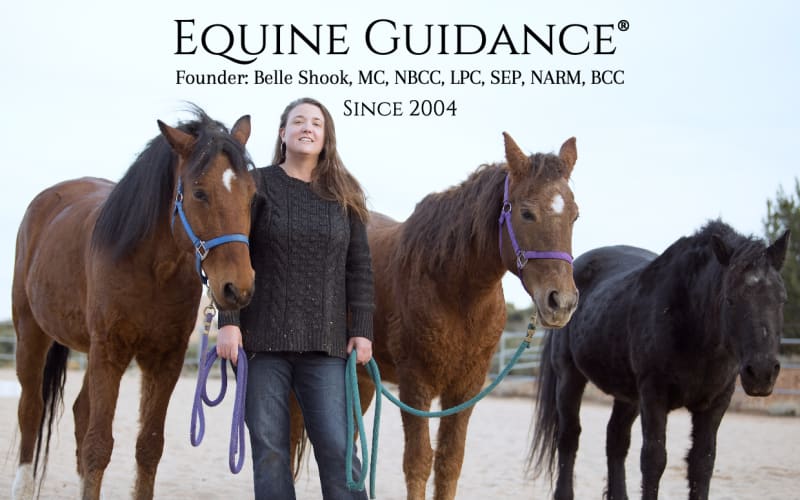 "Journey to your emotional and spiritual well-being, or unlock the door to profound trauma healing like never before. The Equine Guidance® Method engages your innate healing intelligence and organizes your nervous system. Equine Guidance® is a respectful and sacred collaboration between horses & humans. Join the herd with boots & hooves on the ground to catch your neurobiology up to your self-awareness, insight, & clarity. Take a quantum leap toward your soul's purpose. This exclusive destination experience is ideal for adults and couples seeking a private transformative three-hour experience or a multi-day retreat. Belle Shook, MC, NCC, LPC, SEP, NARM, BCC, is a master healer with a visionary approach to somatic equine therapy & coaching."
