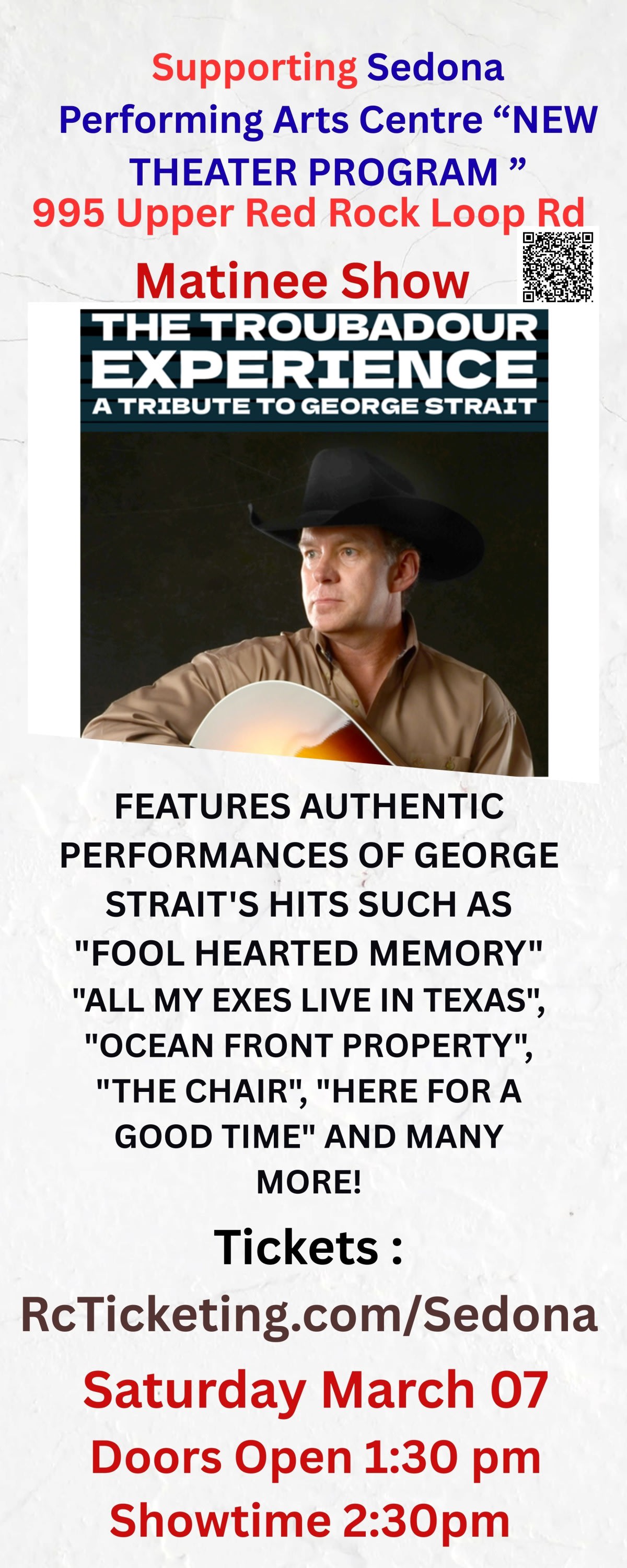 Featuring Authentic performance of George Strait's hits such as 'Fool Hearted Memory', 'All My Exes Live in Texas', Ocean Front Property', 'The Chair', 'Here for a Good Time', and many more. Tickets at RcTicketing.com/Sedona. Buy all 3 concerts for $100, coupon code: SwinterImages